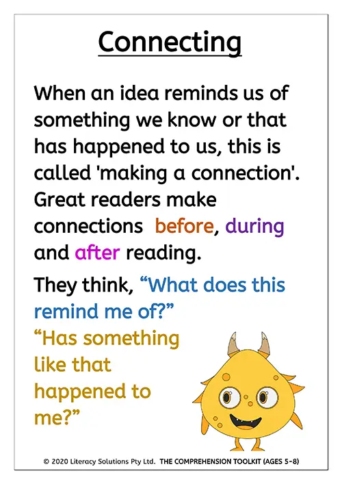- Revisit one or two key sections of the text to prompt for ‘during reading’ connections.