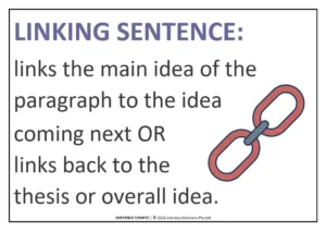 L = Link: This sentence may connect the ideas from one paragraph to the next to ensure a smooth transition across paragraphs. Alternately, the sentence may link the ideas in that paragraph to the author’s overall thesis, opinion, or topic of the essay.
