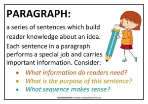 It is important for students to know every sentence must earn its place. Quality paragraphs are comprised of carefully crafted, well-executed, quality sentences. A quality sentence is one which provides essential information or information which ‘value adds’. Students must learn to ask themselves, “What am I trying to say and to whom? What do I want my audience to know, understand or think? How can I best achieve this?”